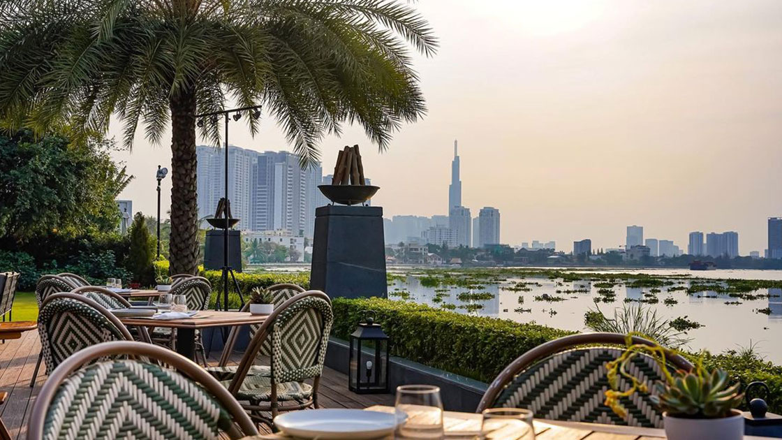 Dining is threefold, Kitchen by the River serves elevated yet relaxed fusion cuisine with river views, The Muse rooftop bar offers signature cocktails and tapas in a chic atmosphere, perfect for sunsets over Saigon and the Living Room (or Bánh by Mia) provides café-patisserie delights, gourmet coffee, and light bites.
